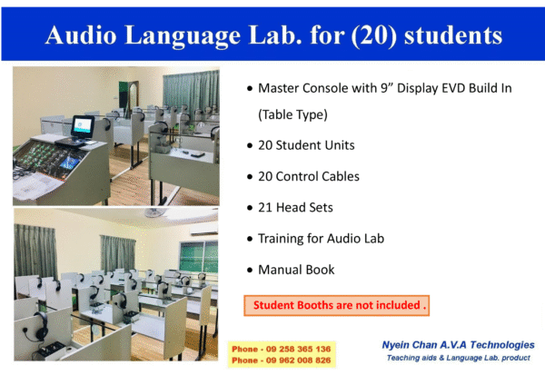 Audio Language Lab. သည် ဘာသာစကားများ သင်ကြားရာတွင် အသုံးဝင်သော သင်ကြားရေးအထောက်အကူပြုပစ္စည်းဖြစ်ပါသည်။ NCAVA Brand Audio Language Lab. သည် EVD Player (bulid in) ပါရှိသောကြောင့် သင်ကြားရေးသုံး CD , DVD များကိုအသုံးပြု၍ သင်ခန်းစာများကို အလွယ်တကူသင်ကြားနိုင်ပါသည်။ Aux-mode ပါရှိသောကြောင့် Laptop သို့မဟုတ် သီးခြား Audio Source များနှင့် ချိတ်ဆက်အသုံးပြုနိုင်ပါသည်။ Audio Language Lab. function များဖြစ်သော စာသင်ခန်းတစ်ခုလုံးကို တပြိုင်နက်သင်ကြားပို့ချနိုင်သော All Call function ၊ ကျောင်းသားတစ်ဉီးစီနှင့် သီခြားဆွေးနွေးသင်ကြားနိုင်သော Intercon function ၊ လိုအပ်သလို Group ဖွဲ့သင်ကြားနိုင်သော Conference function နှင့် ကျောင်းသားများကို check လုပ်နိုင်သော Monitor Function တို့ပါရှိပါသည်။ Audio Language lab. ကိုအသုံးပြုပြီး ဘာသာစကားများသင်ကြားပါက အသံအာရုံစူးစိုက်မှုအား ပိုမိုကောင်းမွန်သဖြင့် လေ့လာမှုစွမ်းရည်မြင့်တက်စေပါသည်။ Standard ဒီဇိုင်း Audio Language Lab. သည် လိုအပ်ပါက ကျောင်းသားအရေအတွက် (၅၀)အထိထပ်တိုးနိုင်ပါသည်။